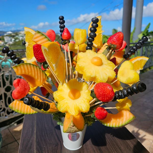 Fresh seasonal fruit arrangements designed to look like bouquets.